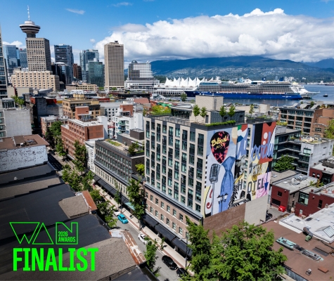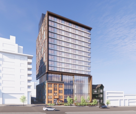Heritage buildings reconstructed for facade of new 15-storey hotel and industrial building in Mount Pleasant in Vancouver